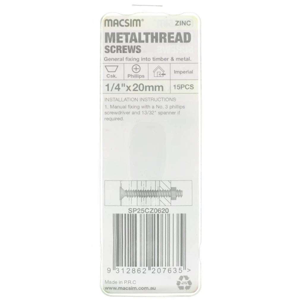 MACSIM 1/4"x20mm METALTHREAD Bolt Countersunk Zinc SP25CZ0620