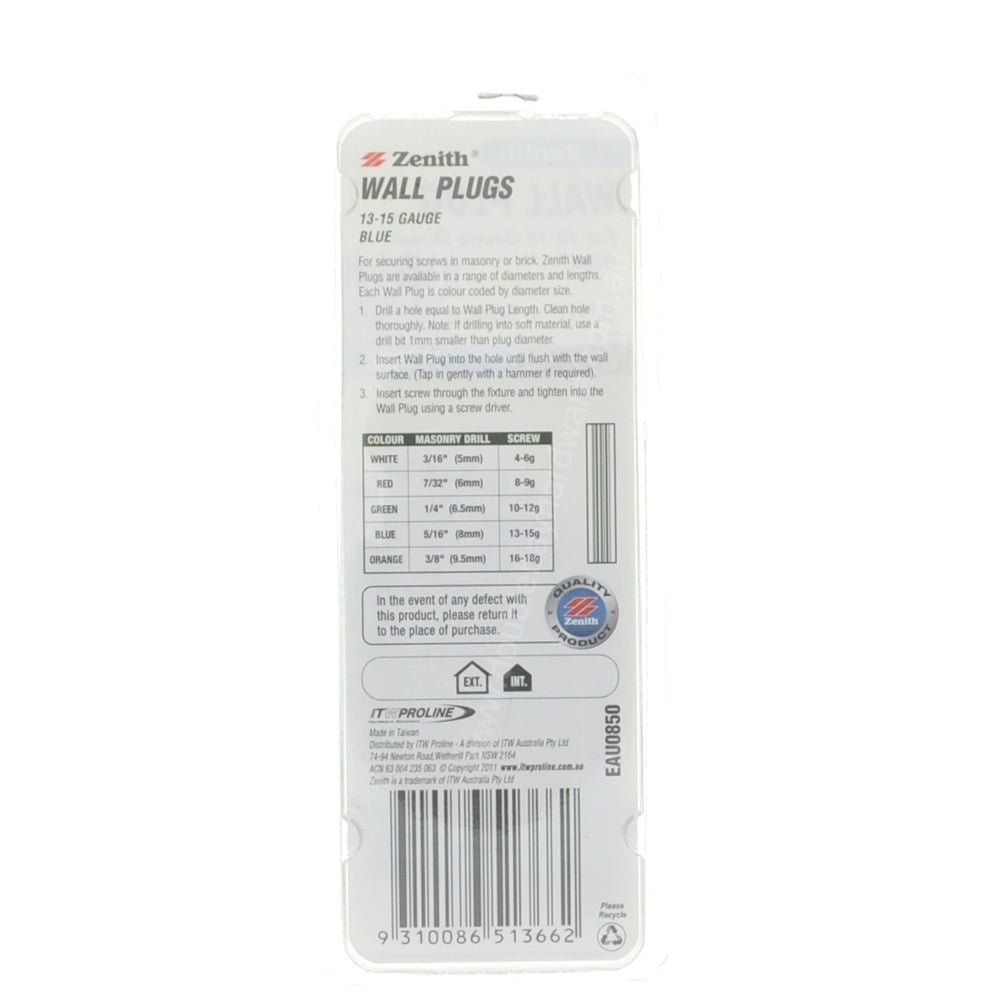 Zenith Wall Plug Blue 5/16"x50mm For 13-15 Gauge Screw EAU0850