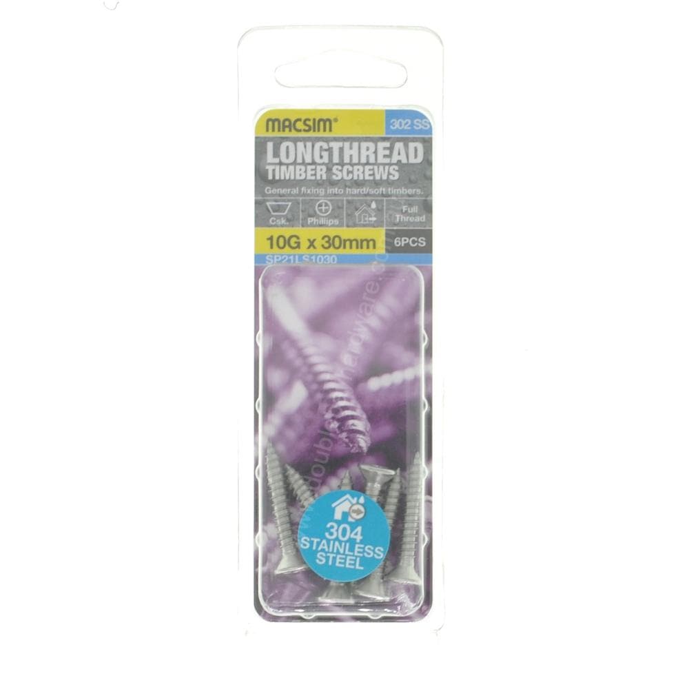 MACSIM LONGTHREAD Timber Screws Countersunk 10Gx30mm 302SS SP21LS1030