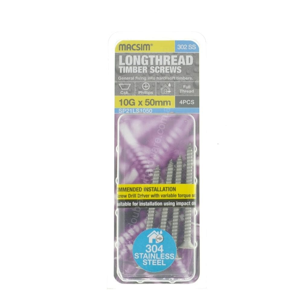MACSIM 10Gx50mm Countersunk LONGTHREAD Timber Screw Stainless Steel SP21LS1050