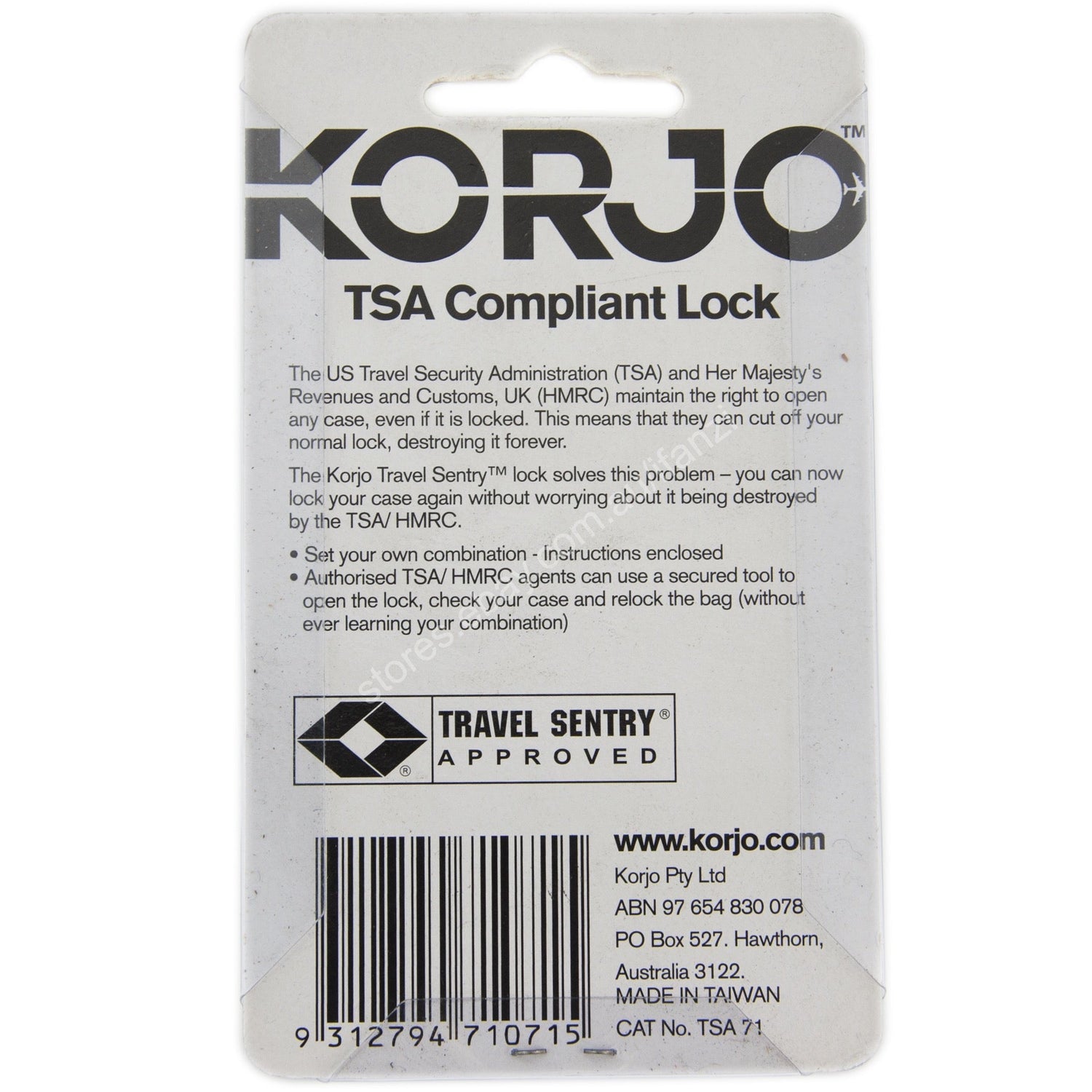 - * The US Travel Security Agency (TSA) and Her Majesty's Revenues and Customs (HMRC) maintain the right to open any case, even if it is locked. This means that they can cut off your normal lock, destroying it forever. The Korjo Travel Sentry Lock solves this problem - you can now lock your case again without worrying that it will be destroyed by the TSA/HMRC. - Set your own combination (instructions enclosed). - Authorised TSA / HMRC agents can use a secured tool to open the lock, check your case and relock it (without ever learning your combination).