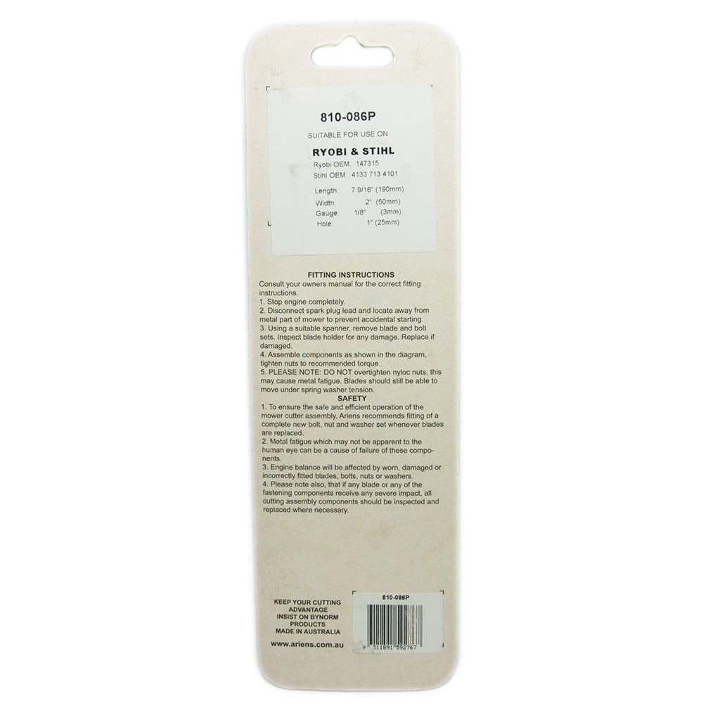 Measuring 190mm (7 9/16") in length and 50mm (2") in width with a 3mm (1/8") gauge and 25mm (1") center hole, this blade is engineered to exact specifications for reliable fitment and performance. Compatible with Ryobi OEM 147315 and Stihl OEM 4133 713 4101, it's the perfect replacement to restore your edger's cutting performance and maintain crisp, professional-looking lawn borders.