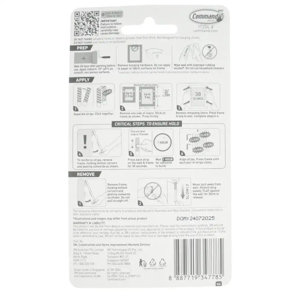 3M Command Medium Picture Hanging Strips provide a damage-free solution for hanging picture frames without nails, hooks, or tools. This pack includes 4 sets of medium strips designed to hold frames up to 5.4kg or sizes up to 45.7 x 60.9cm (18" x 24"), making decorating quick and easy.
