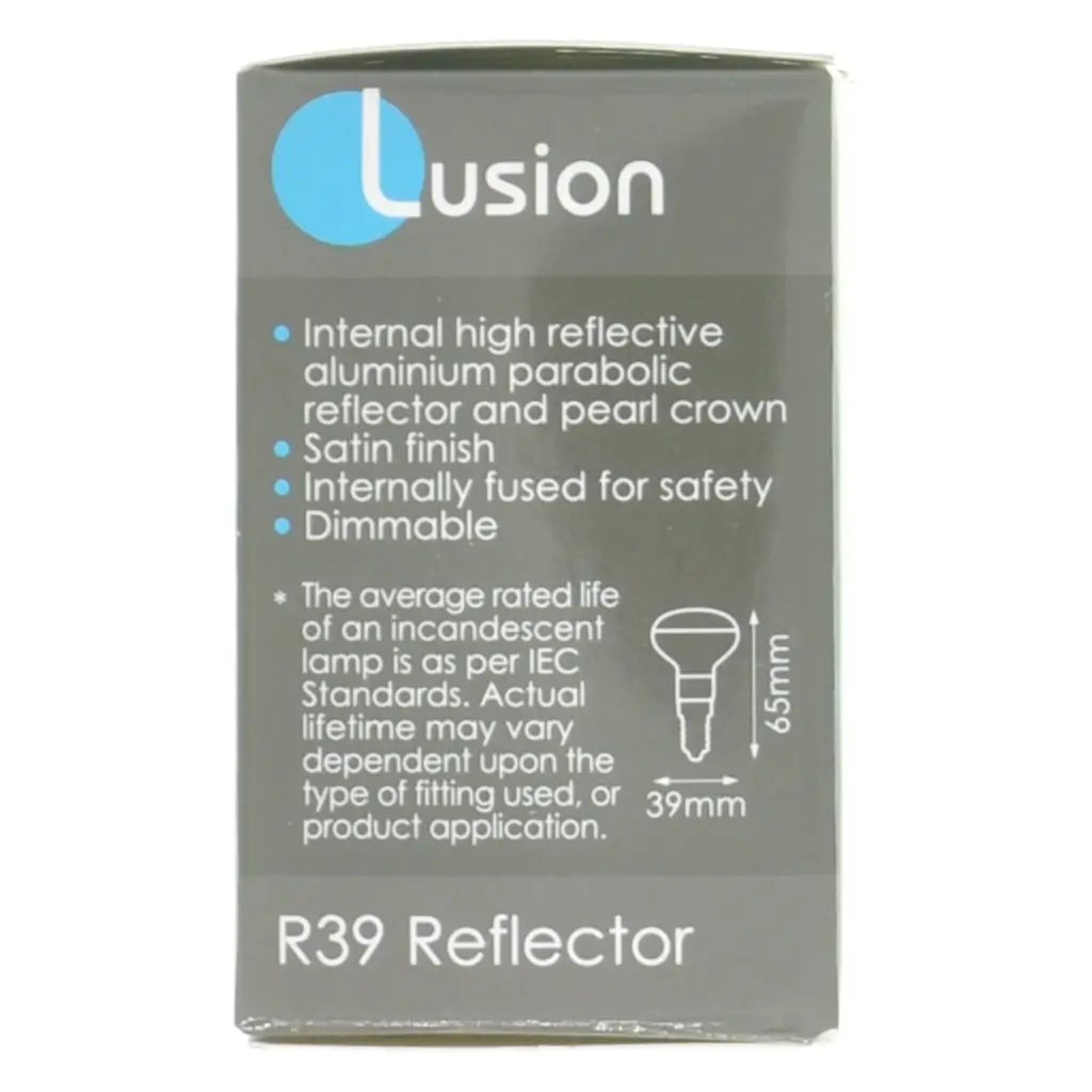 The Lusion R39 Reflector Bulb combines precision-engineered optics with quality construction to deliver focused, directional lighting for compact fixtures. Featuring an internal high-reflective aluminium parabolic reflector with a pearl crown and satin finish, this 30W bulb maximizes light output while minimizing glare. Built with internal fusing for enhanced safety, it's the ideal solution for small downlights, track lighting, and accent fixtures requiring the E14 small Edison screw fitting.