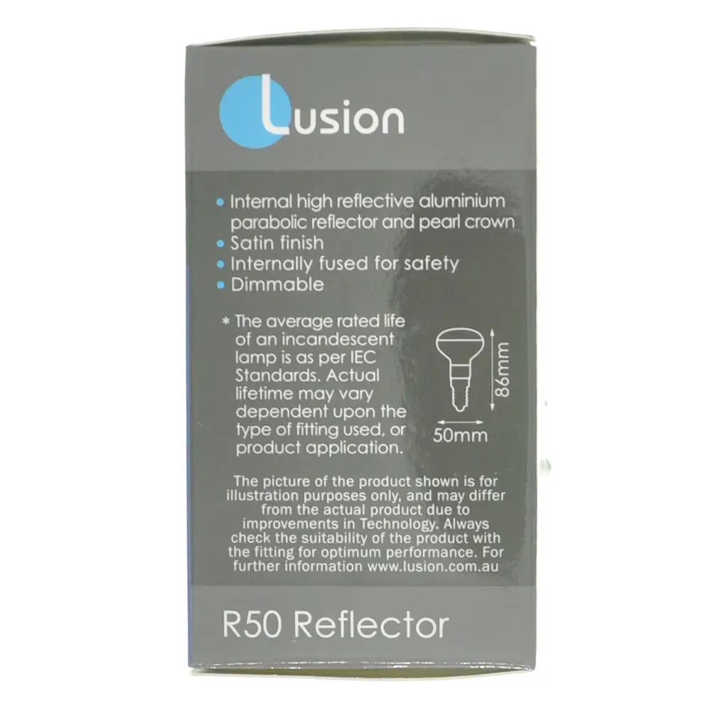Lusion's R50 Reflector Incandescent bulb features premium construction with an internal high-reflective aluminium parabolic reflector and pearl crown for superior light distribution. The elegant satin finish delivers warm, focused illumination ideal for smaller downlights, display lighting, and accent applications throughout your home.
