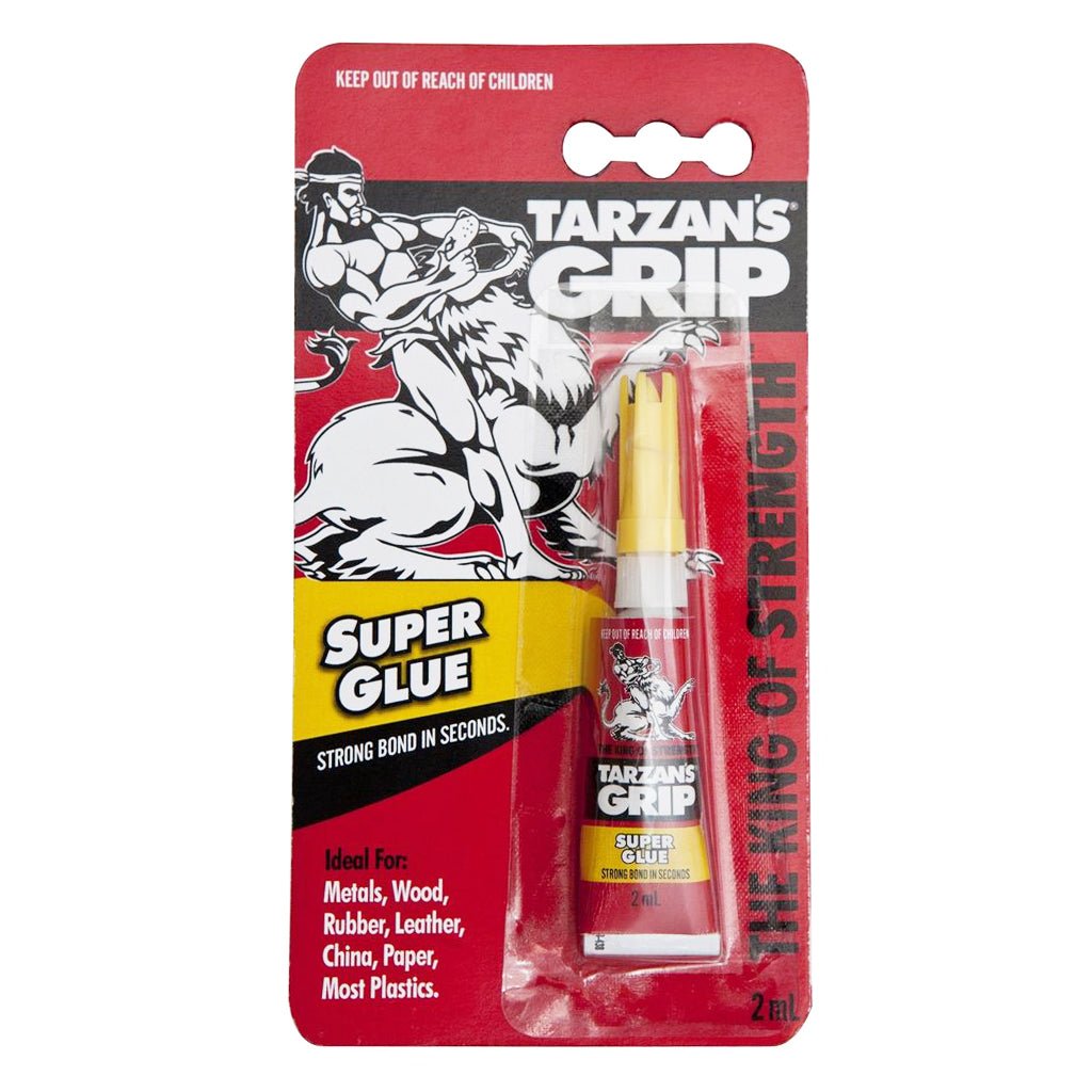 - Tarzans Grip Super Glue is a fast-setting cyanoacrylic acid ester based adhesive. Tarzan's Grip Super Glue dries colourless.