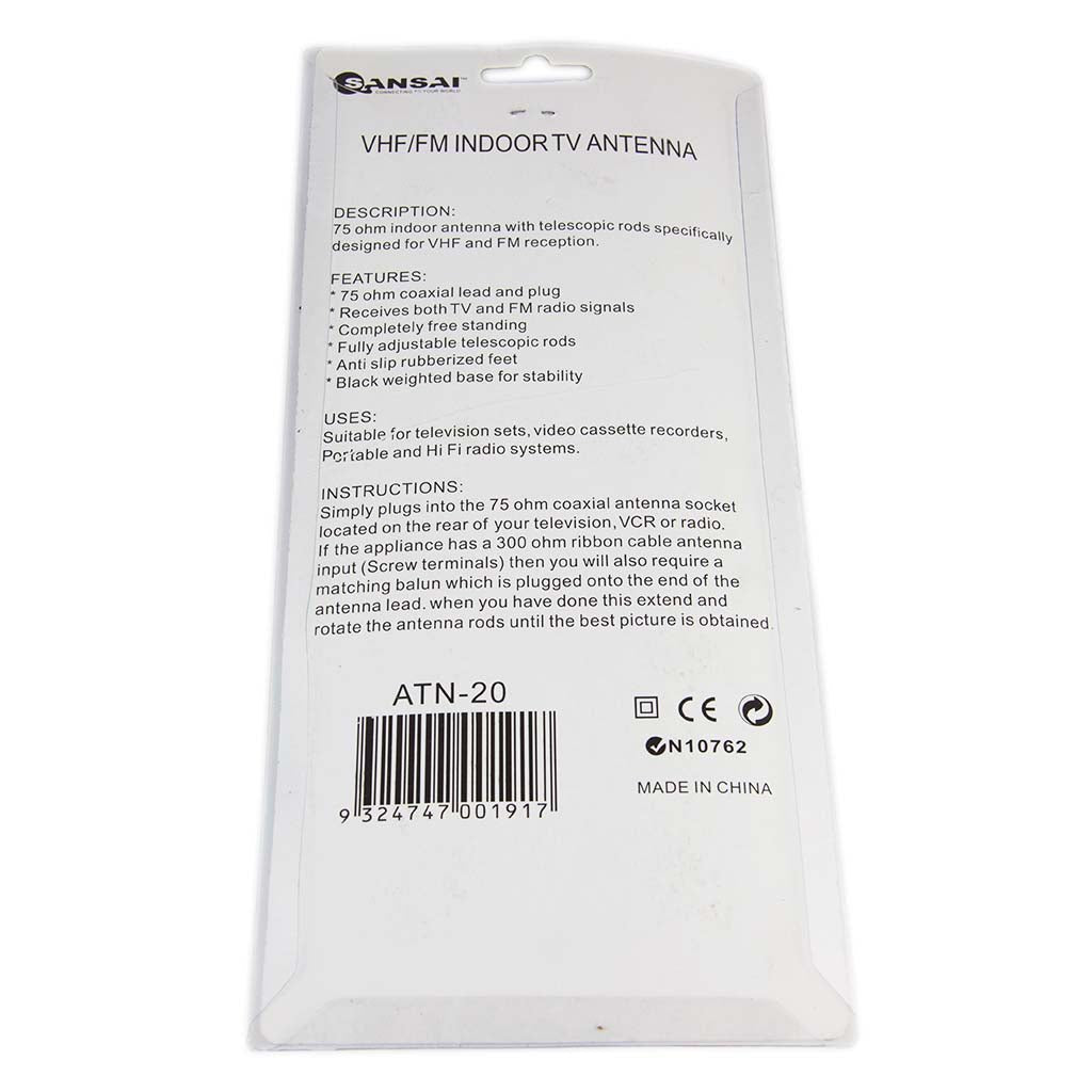 - 375 ohm indoor antenna with telescopic rods specifically design for VHF and FM reception.