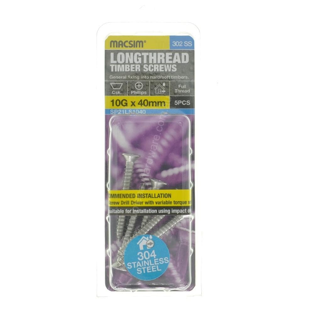MACSIM 10Gx40mm Countersunk LONGTHREAD Timber Screw Stainless Steel SP21LS1040