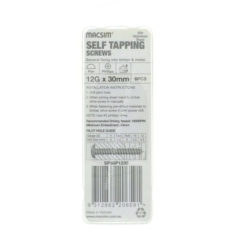 MACSIM 12Gx30mm PAN HEAD SELF TAPPING Screws Phillips Stainless Steel SP56P1230