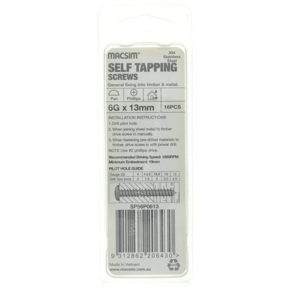 MACSIM 6Gx13mm PAN HEAD SELF TAPPING Screws Phillips Stainless Steel SP56P0613