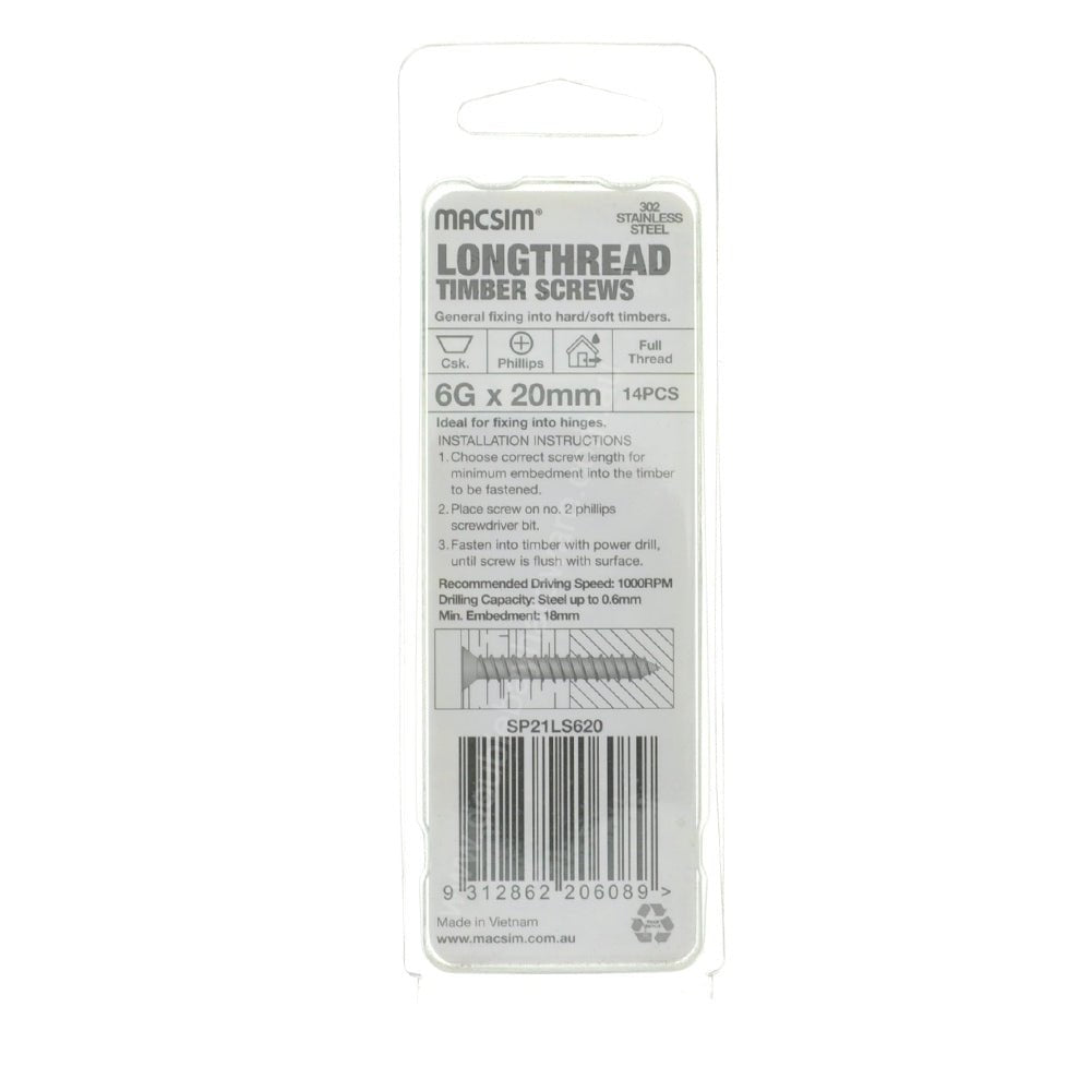 MACSIM 6Gx20mm Countersunk LONGTHREAD Timber Screw Stainless Steel SP21LS620