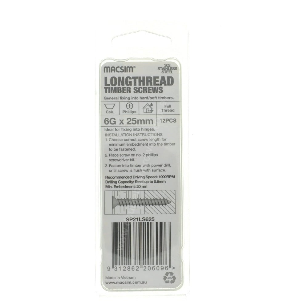 MACSIM 6Gx30mm Countersunk LONGTHREAD Timber Screw Stainless Steel SP21LS625