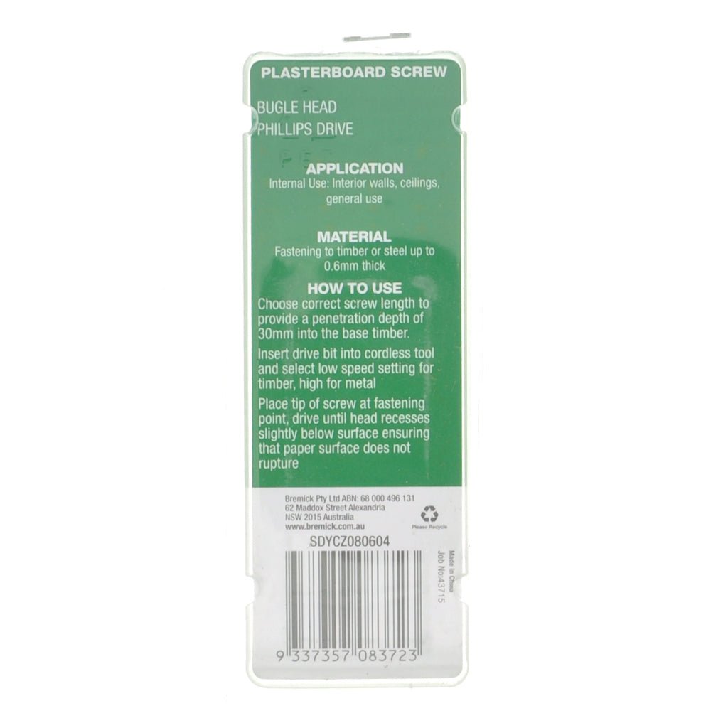 Bremick 8Gx60mm Bugle Plasterboard Screw Phillips Zinc Plated 20Pcs
