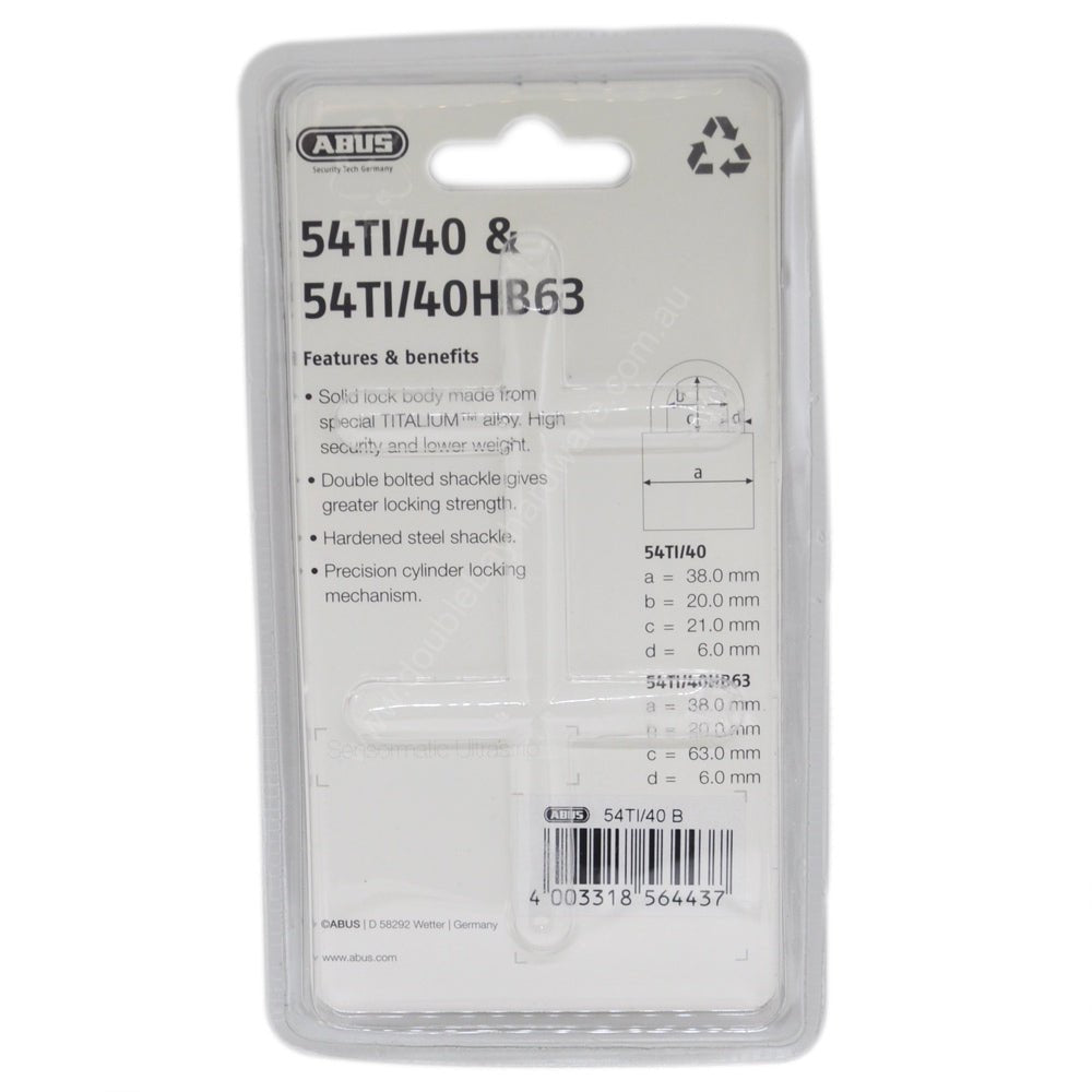 ABUS Titalium 38mm Padlock Strong & Rust Free 54TI/40 is backordered and will ship as soon as it is back in stock.