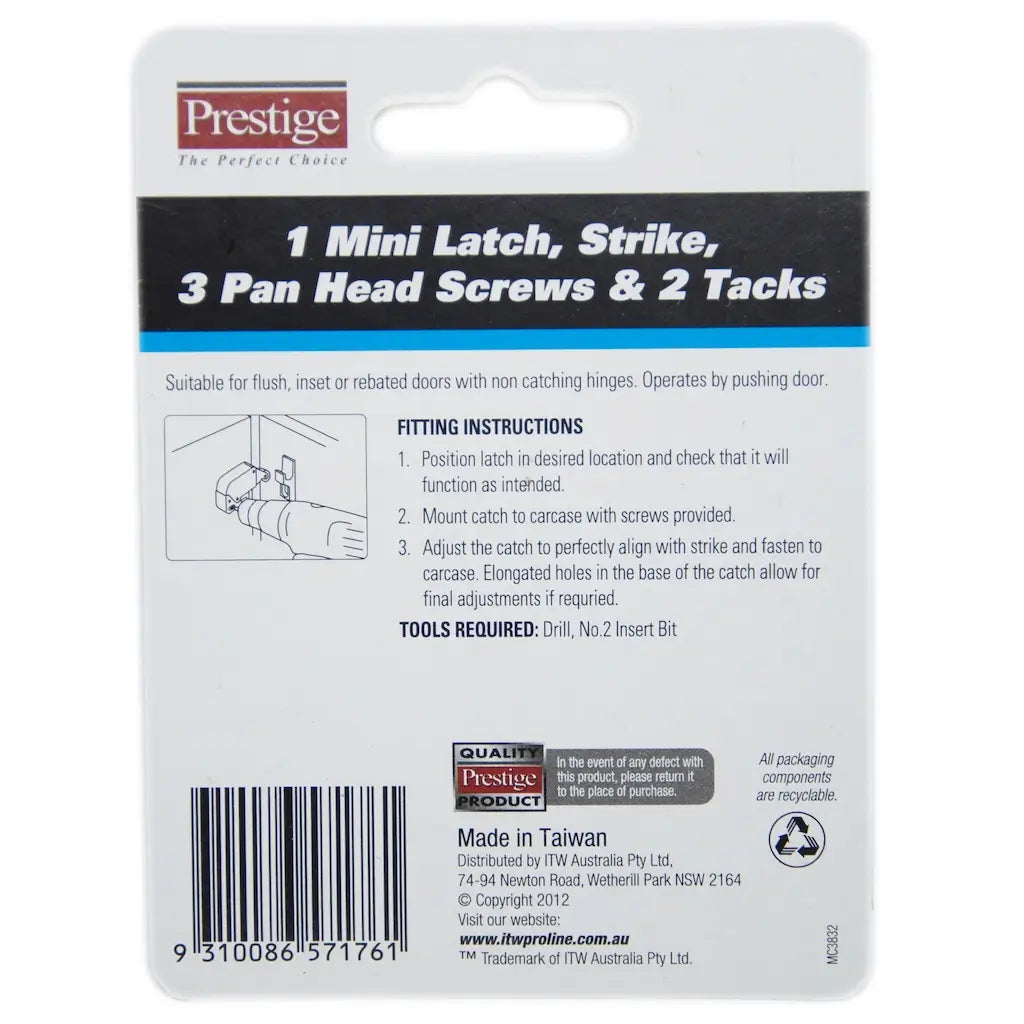 The Prestige Mini Latch delivers compact, reliable closure for concealed cupboards and space-constrained cabinetry. Featuring a white plastic housing with a nylon roller and strike, this slimline latch provides smooth, quiet operation ideal for modern cabinet applications where minimal hardware visibility is desired.